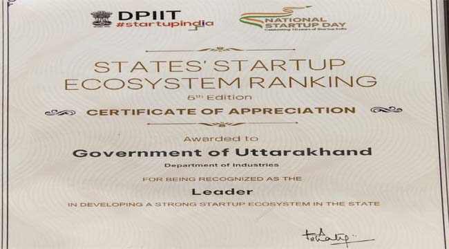 This honour is a matter of pride for Uttarakhand. Our government has developed favourable policies, simple processes and a strong ecosystem to promote startups. The youth of the state have an incredible potential for innovation, and the government is providing them support at every level. This achievement is the result of the collective efforts of all entrepreneurs, startups and officials of the state.